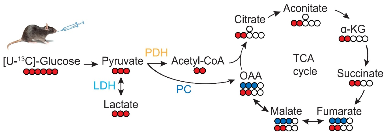 圖:口服[U-13C]葡萄糖后雌雄小鼠外周血中 13C 標記的糖酵解和 TCA 循環(huán)代謝物分析示意圖